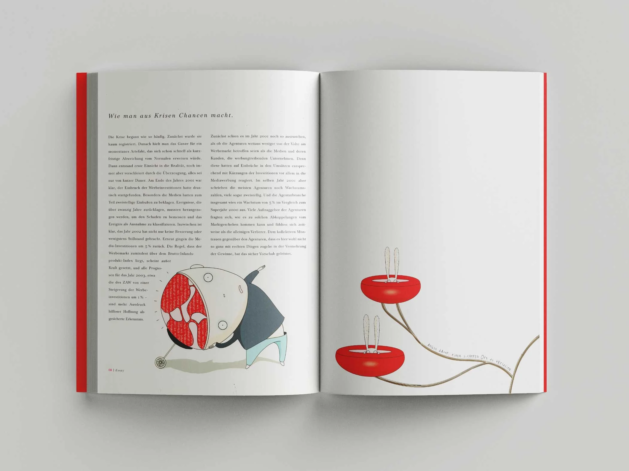Thanks to its progressive creative direction, it was possible to design the annual report throughout with extraordinary illustrations. For this concept, Ogilvy received the Bronze Medal in the Illustration category from the Art Directors Club Germany in 2003.
